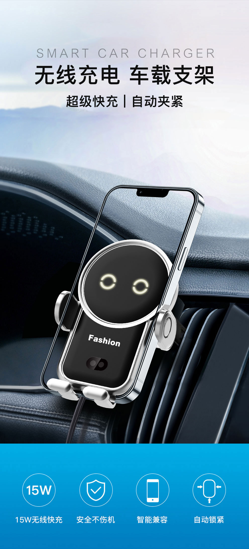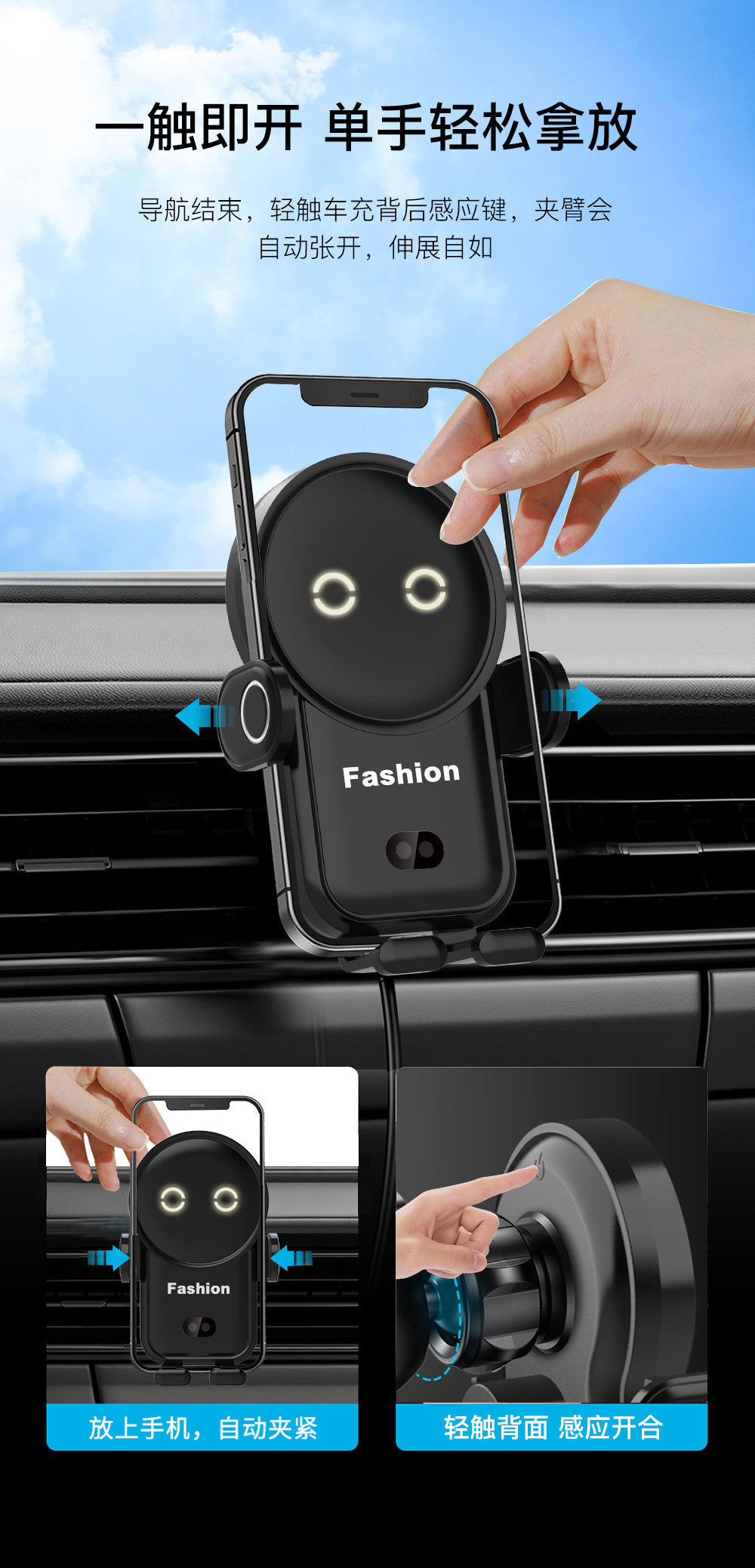 運転中も安心して使える車 スマホホルダーです。 重力式自動開閉機能により片手で簡単に端末を固定でき、走行中の振動にも強くしっかりとホールドします。 ワイヤレス充電機能を搭載しているので置くだけで充電が可能です。 吹き出し口に取り付けるタイプで角度調整も自由自在、快適なドライブをサポートします。