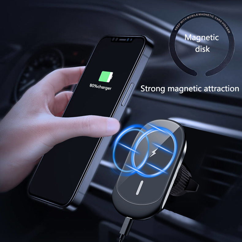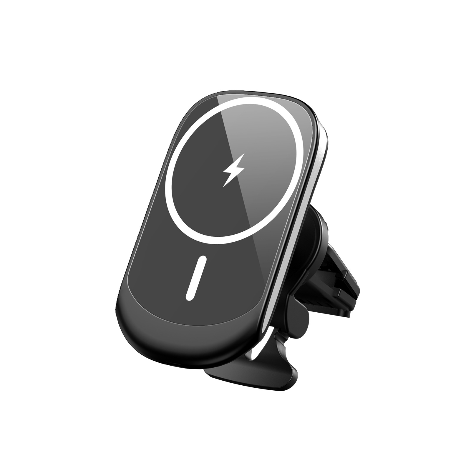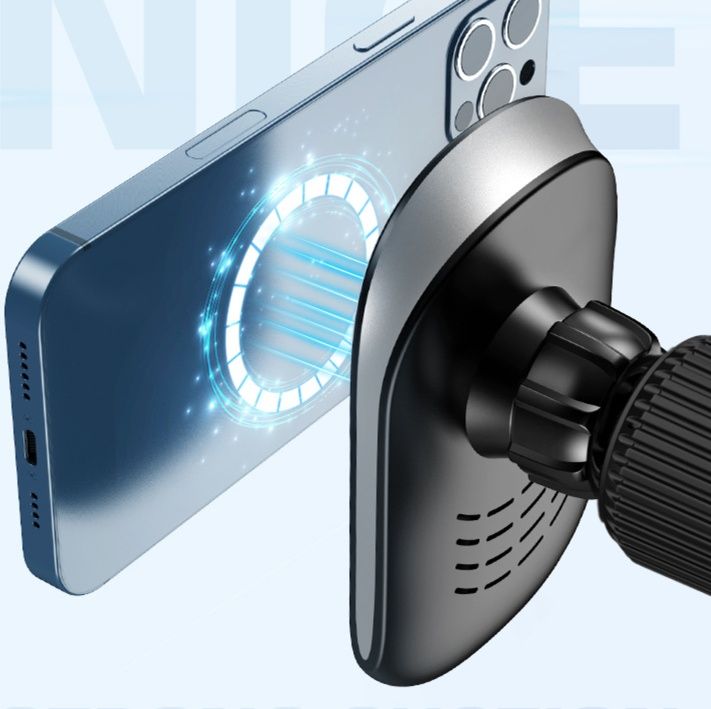 強力なマグネットで端末をしっかり固定する車 スマホホルダーです。 冷暖房の吹き出し口に簡単に取り付けられ、運転中も端末を安全に保持します。 ワイヤレス充電機能を搭載しており、置くだけで自動的に充電が開始されます。 専用のマグネット円盤を端末に貼り付けるだけで使用可能です。 片手で着脱できる便利な設計で、運転中の操作性も抜群です。
